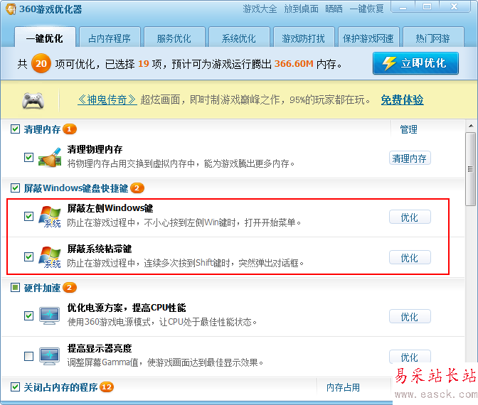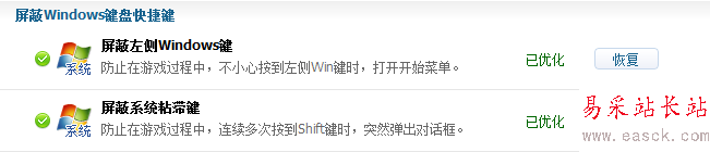 3、進(jìn)入游戲優(yōu)化器界面后我們可以看到當(dāng)前可以為游戲進(jìn)行優(yōu)化的選項(xiàng),其中兩項(xiàng)就是屏蔽左側(cè)windows鍵和屏蔽系統(tǒng)粘滯鍵,這兩個(gè)就是造成以上情況的原因了,我們可以把這兩個(gè)都給屏蔽了。