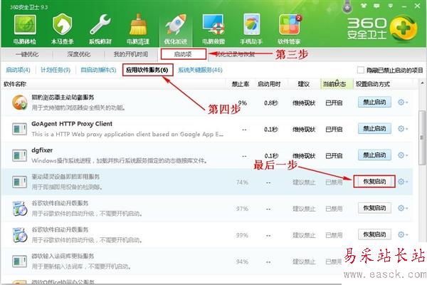 那么可以試下在360的“管理應用軟件”選項中點擊“開機啟動”,就會顯現所有的開機啟動軟件,要設置那個就把那個軟件后面的“恢復啟動”按鈕點擊。