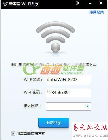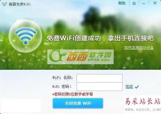 WiFi名稱密碼可以自由修改,若您的電腦以前創建過無線熱點,則名稱密碼默認為上次使用名稱。點擊“修改”邊的“小眼睛“,可以隱藏您設置的密碼喲