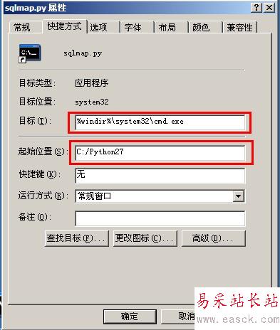 9、點擊剛才創建好的Sqlmap快捷方式右鍵—在目標欄輸入:%windir%/system32/cmd.exe
