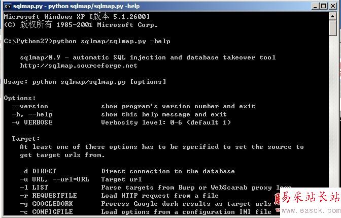創建好之后,運行你剛才創建的SqlMap快捷方式 這樣就可以在WindowsXP運行SqlMap了。