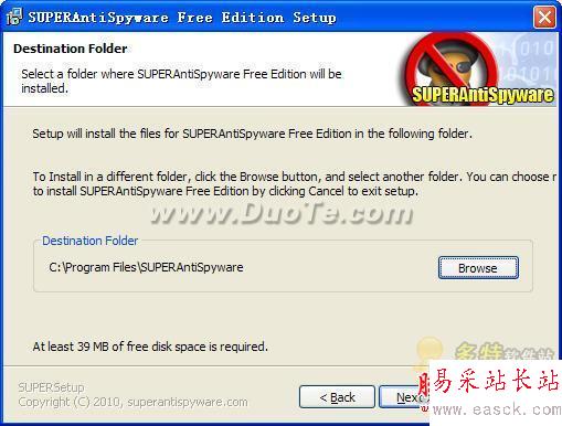 SuperAntiSpyware是國外軟件,用戶下載到安裝程序后,雙擊打開的是下圖所示的英文安裝界面,而沒有提供安裝語言選擇選項(xiàng),好在該軟件的安裝過程非常簡單,只要您有過安裝軟件的經(jīng)驗(yàn)或者有一點(diǎn)英文基礎(chǔ),您就可以很輕松的完成安裝過程。