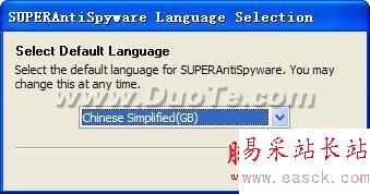當(dāng)以上安裝選項(xiàng)配置完畢即正式執(zhí)行SuperAntiSpyware軟件在本機(jī)的安裝過程,安裝完畢用戶可以看到下圖所示的一個(gè)“選擇默認(rèn)語言”的窗口,默認(rèn)的是英文,用戶可以自行通過下拉菜單找到并選擇使用簡體中文,如圖所示。