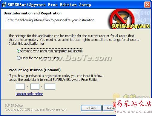用戶在接受了該軟件的安裝許可協(xié)議后,可以指定使用該軟件的用戶(所有用戶和當(dāng)前用戶),另外這是一款免費(fèi)軟件,如果對(duì)它付費(fèi)了,可以填寫注冊(cè)碼,沒有付費(fèi)可以忽略注冊(cè)碼的選項(xiàng)(見圖2),此后,該軟件提供了選擇安裝位置的選項(xiàng)(見圖3),方便用戶將軟件安裝到指定位置。