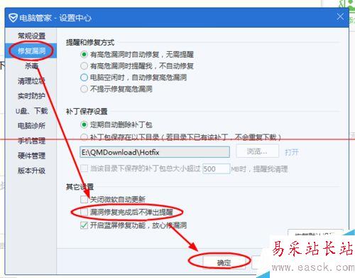 3、在【設置中心】界面下,點擊選擇【修復漏洞】-->勾選【漏洞修復完成后不彈出提醒】選項-->【確定】完成設置。(如圖所示)