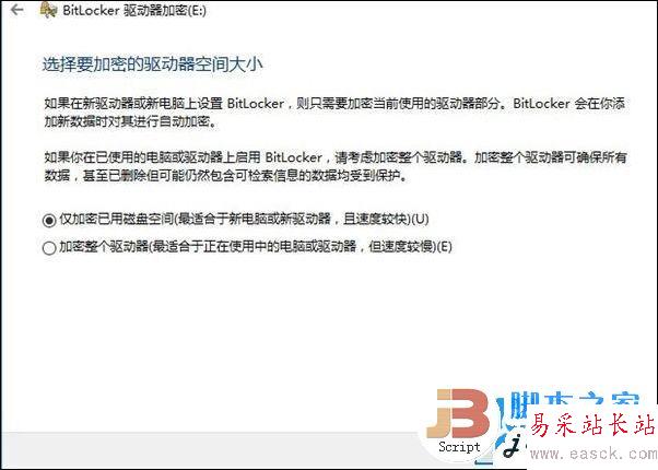 兩個選擇,僅加密已用磁盤空間或者加密整個驅動器,一般選擇加密磁盤空間。