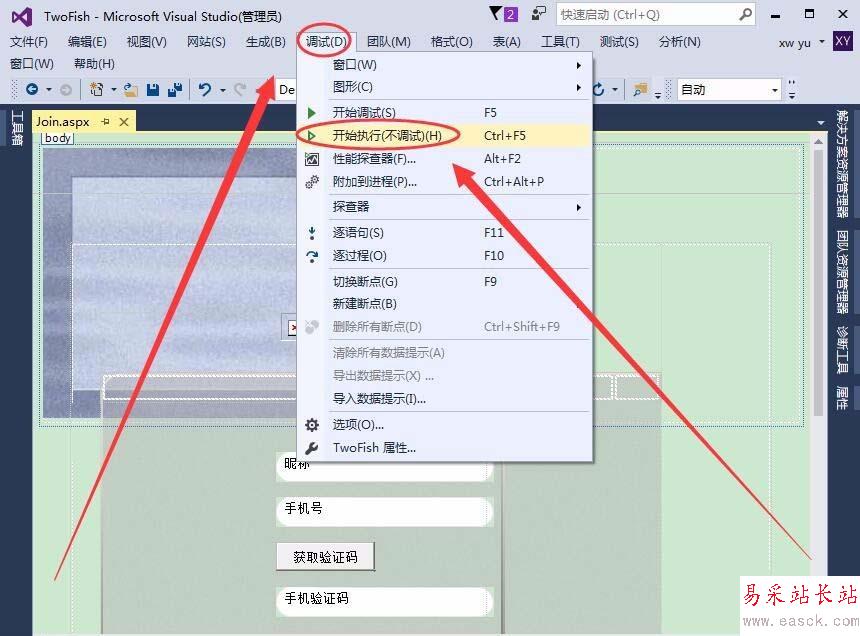 方法二:單擊調試菜單,選擇開始執行(不調試)選項。