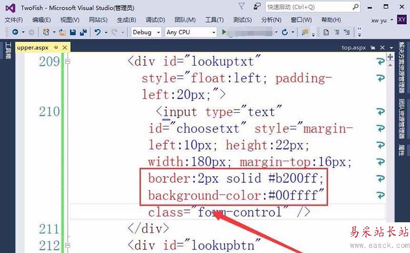 6、邊框的寬度設置為2像素,顏色為藍色,輸入框的背景色設置為00ffff。