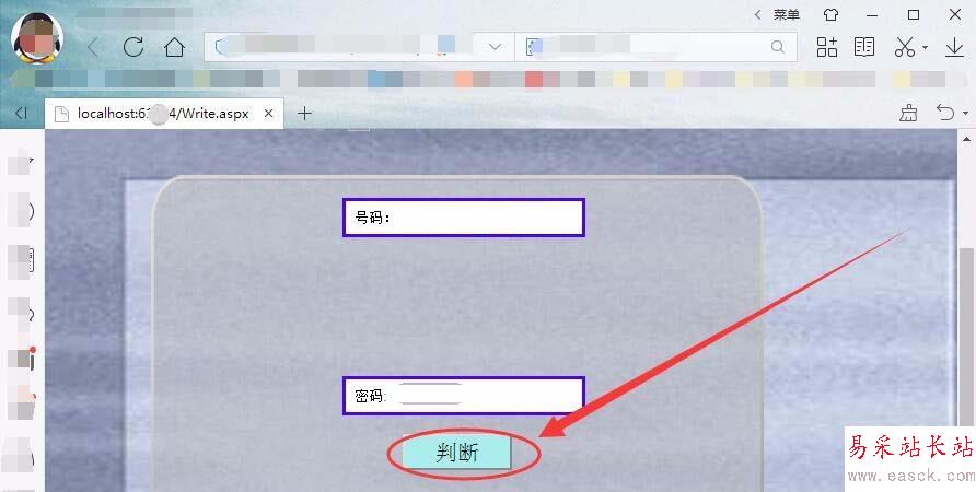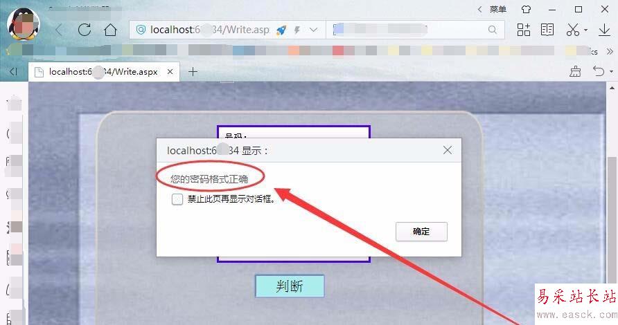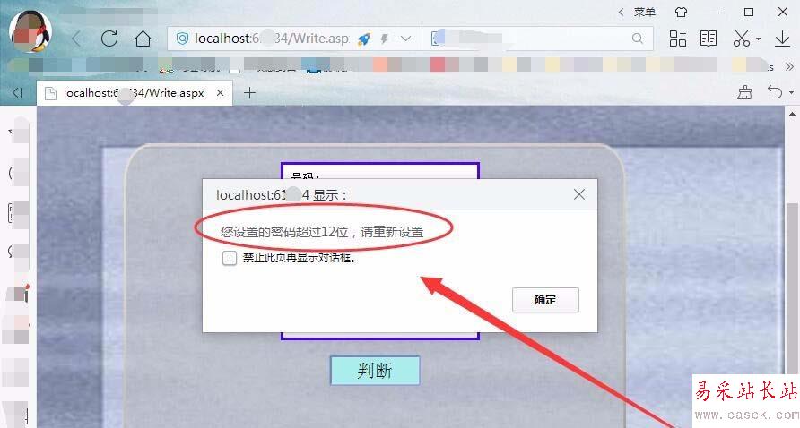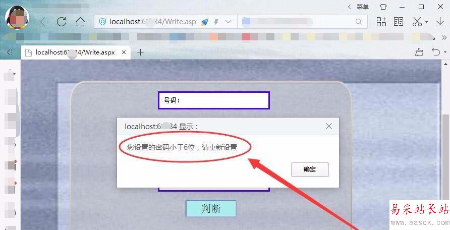 8、瀏覽網頁,輸入小于6位的密碼后,單擊判斷按鈕會提示您設置的密碼小于6位,要求重新輸入密碼。