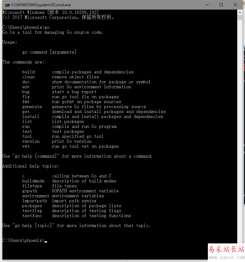 GOPATH= D:/Phoenix/CodingMe/go ,意思是我的 GOPATH 是 d:/xxx 這個路徑,以后我把這個路徑作為 go 項目(代碼、編輯文件、可執(zhí)行文件)的頂層路徑。cmd 下運(yùn)行 go 命令,顯示 Usage 表示安裝正常。