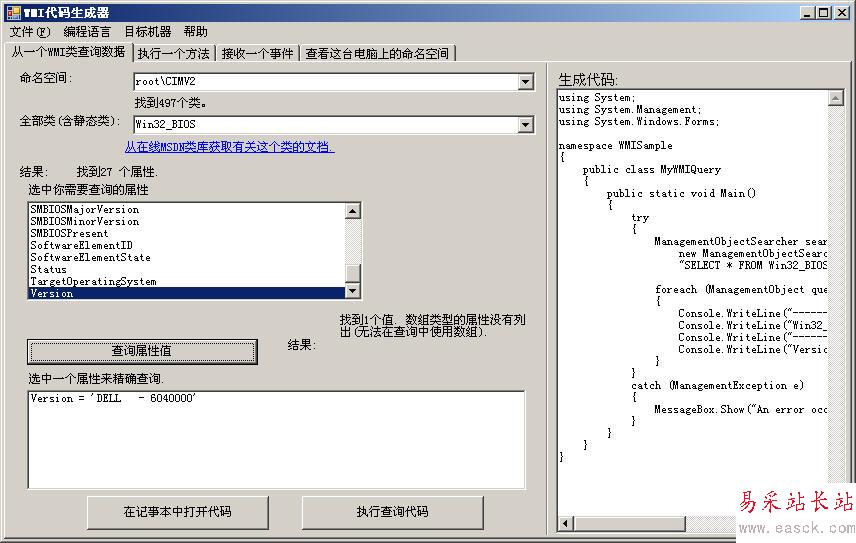 利用WMI代碼生成器可以執行查詢或者執行一個方法等,還可以查看當前或者遠程電腦上的命名空間以及其下的類,并且還可以生成相關的代碼(不然就不叫WMI代碼生成器了),支持生成的代碼類型包括VBS、C#及VB.NET,默認生成的代碼是VBS。