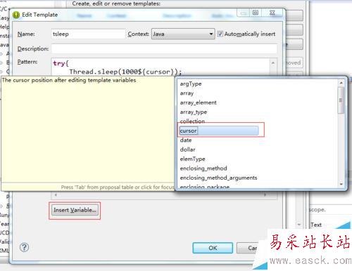 4、注意上圖中輸入的${cursor},這是通過點擊“Insert Variable...“插入光標。還有更多的選項,可以自己嘗試下。