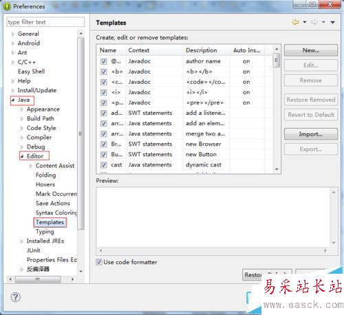 2、在Preferences”對話框中點擊“Java”->“Editor”->“Templates”。