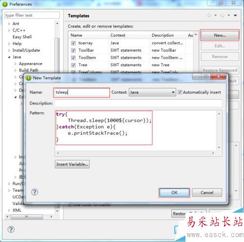 3、然后在有面窗口中,點擊“New”,彈出“New Template”對話框,在里面我們可以設置自定義的代碼模板的名字以及代碼的具體內容。比如:我定義了一個叫做tsleep的模板,當輸入tsleep,并按下alt+/的時候,編輯器會自動替換成: