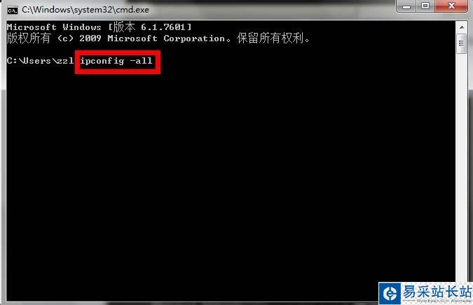 2、出現“命令提示符”對話框,輸入“ipconfig -all”命令后回車!