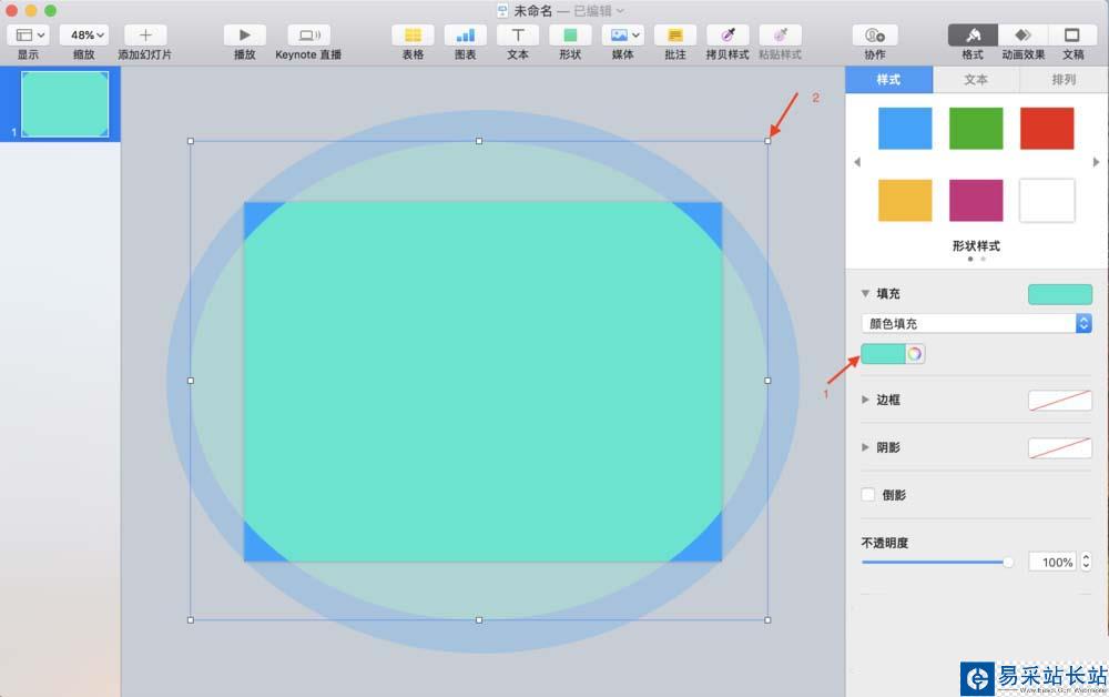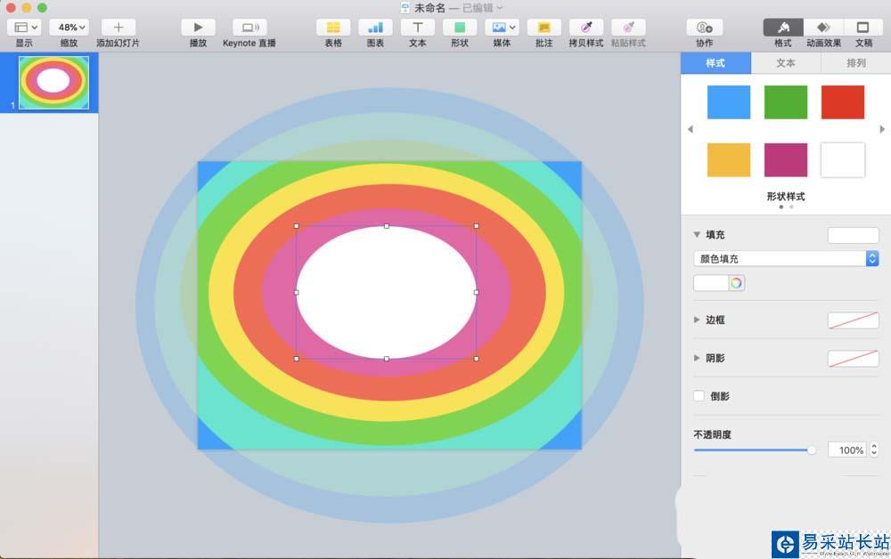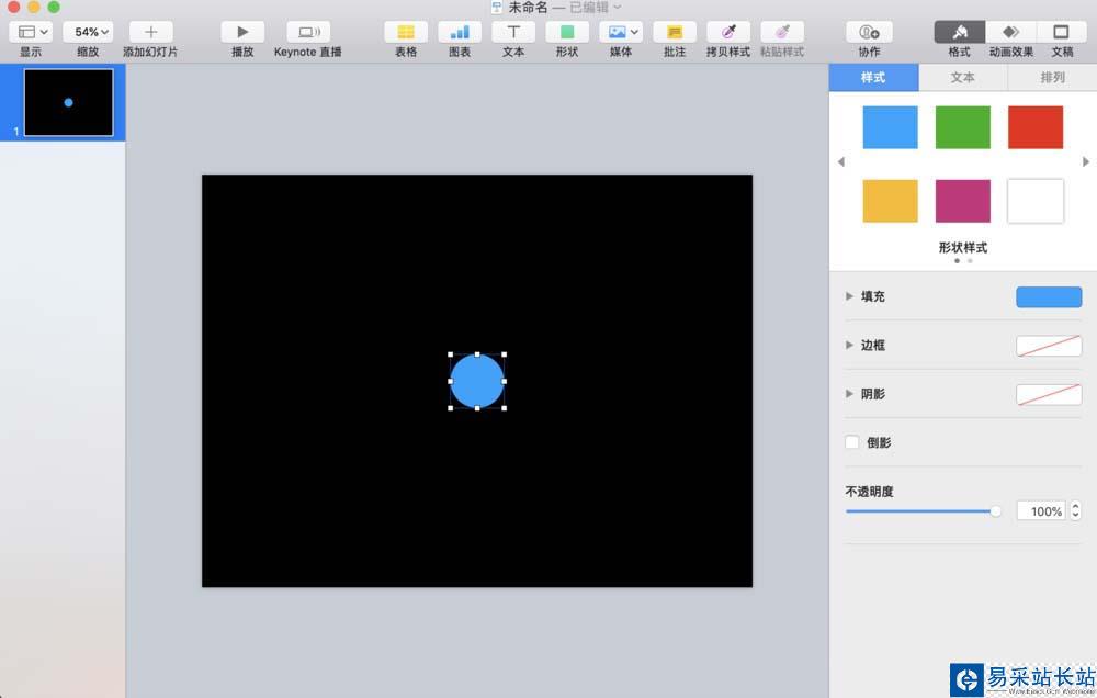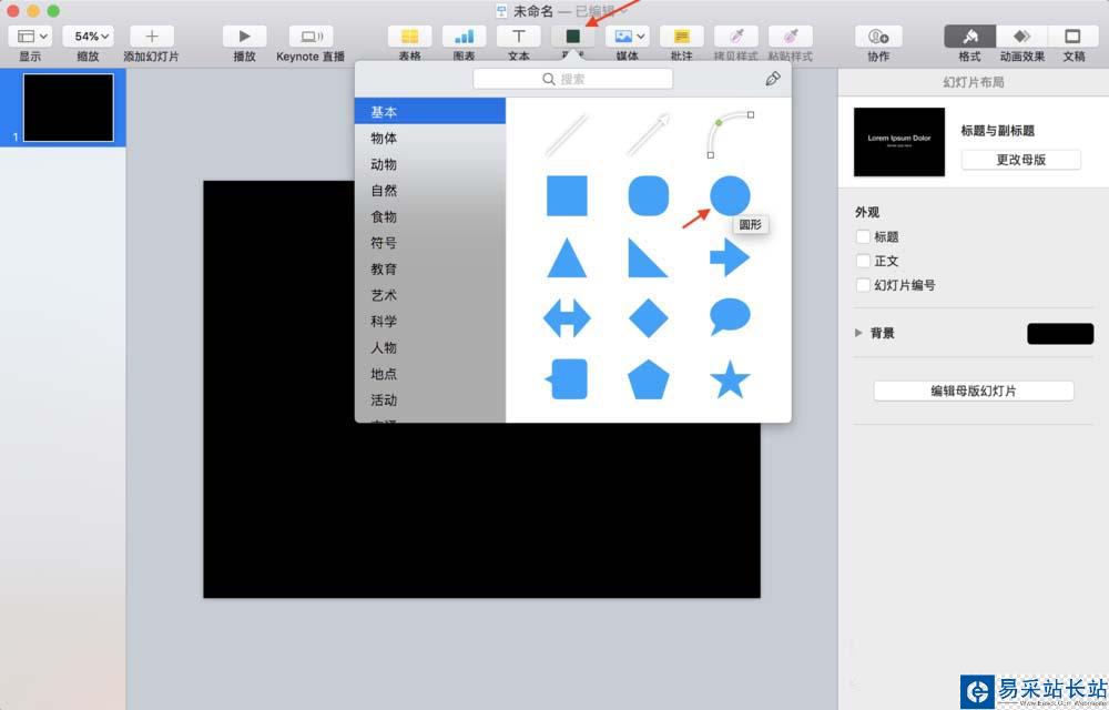 1、首先keynote軟件,新建文稿,工具欄上選擇“形狀”-》基本,選中圓形圖標