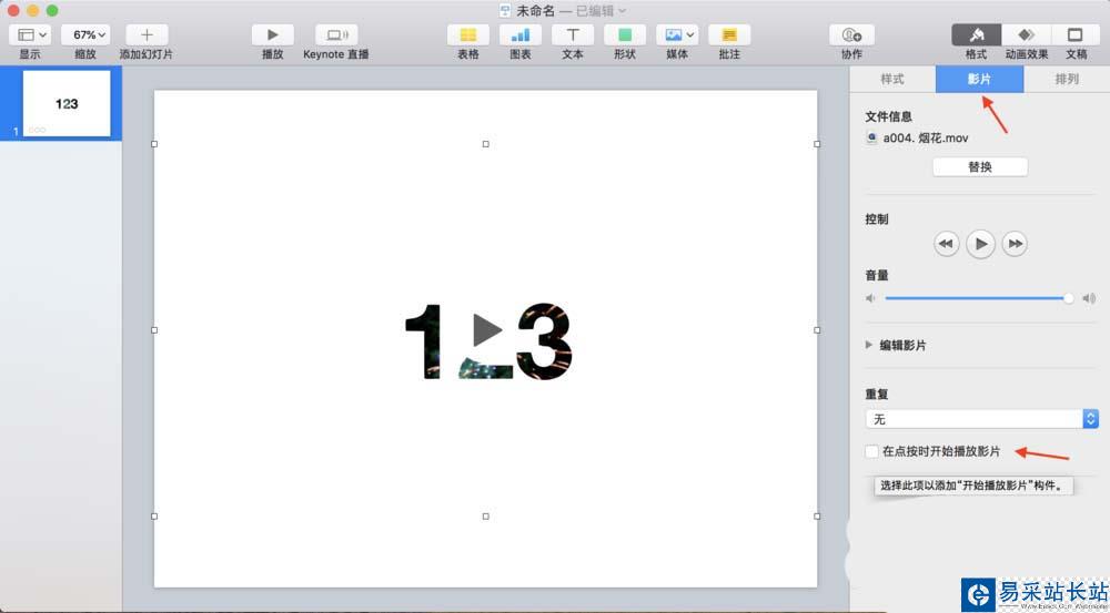 7、點(diǎn)擊透視過來的影片,選擇影片,去掉“在點(diǎn)按時開始播放影片”的勾