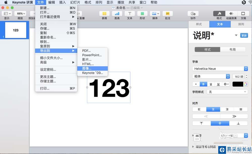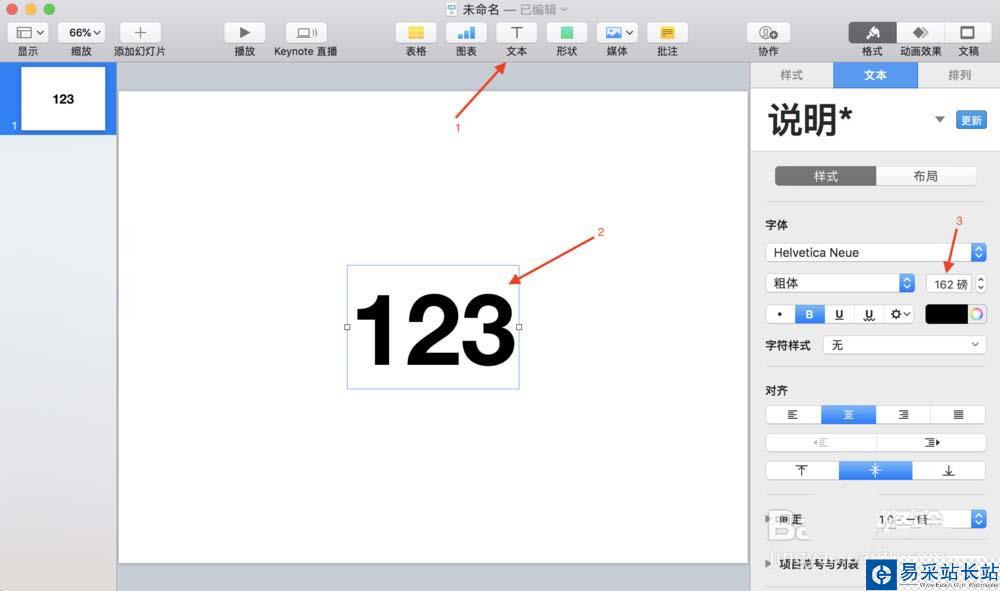 1、打開軟件keynote, 創(chuàng)建一張空白的幻燈片,工具欄選擇文本,然后幻燈片中間輸入文字,接著文本屬性窗口上調(diào)整文字的大小