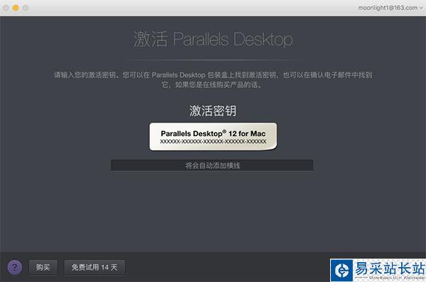 8.如果你已經購買了Parallels Desktop12激活碼,那么輸入激活碼激活即可;如果沒有激活碼想要試用的話,就點擊左下角的“免費試用14天”。