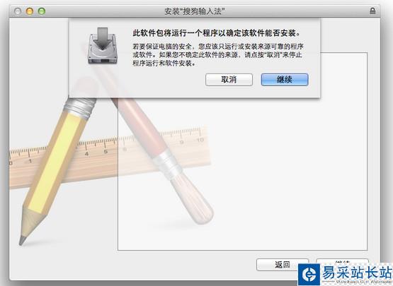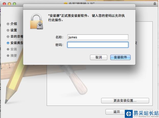 點擊圖標“安裝搜狗輸入法”,按提示操作即可安裝搜狗輸入法 for Mac,中途會要求輸入一次Mac系統開機密碼。如果您不知道密碼,建議詢問買電腦時幫您設置系統或者裝軟件的人。