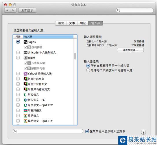 點擊桌面左上角蘋果圖標打開菜單,點擊系統偏好設置,在系統偏好設置窗口點擊“語言與文本-輸入源”,在左側列表找到Sogou-搜狗拼音,打鉤選中(可以在底部輸入框輸入sogou快速查找),同時選中“在菜單欄中顯示輸入法菜單”,可以設置“鍵盤快捷鍵”為cmd+space選擇上一個輸入源