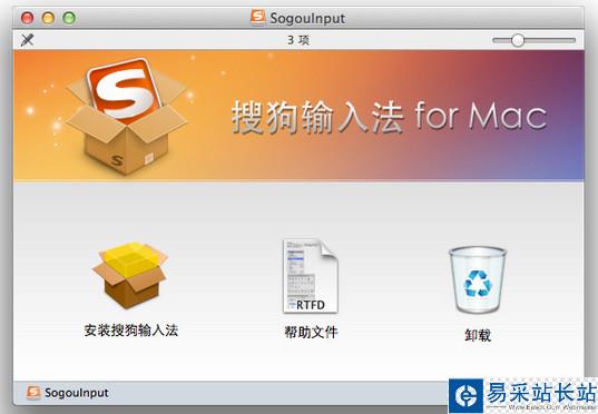 雙擊搜狗輸入法 for Mac 安裝包(sogou_mac_xxx.dmg),在打開的窗口中有三個圖標:安裝搜狗輸入法、幫助文件、卸載