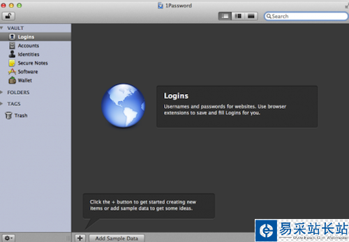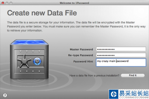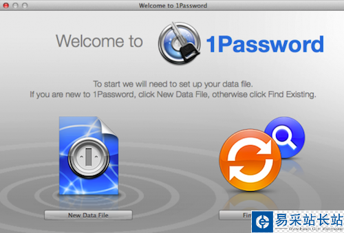 初次運行 1Password 的界面如上圖所示,如果你之前沒有使用過 1Password,應(yīng)該直接選擇”New Data File(新建數(shù)據(jù)文件)”,以后你的密碼數(shù)據(jù)都會保存在這個數(shù)據(jù)文件里面。如果你之前有使用過 1Password 并且已經(jīng)保存了數(shù)據(jù),那么就應(yīng)該選擇”Find Existing(查找已有文件)”,這里我們只是向新用戶介紹如何使用。
