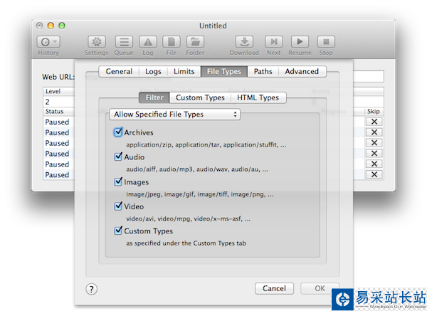 如果你想進一步規定要下載的文件類型那也好辦,Filter選最后一項“Custom Types”,然后切換到第2個Tab,自選詳細的后綴類型即可。