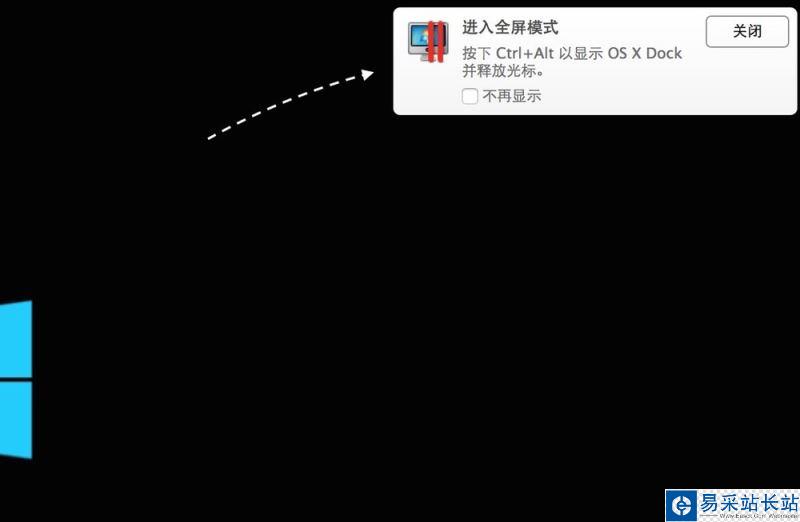 1、之前已經說到,由于 Parallels Desktop 默認是讓虛擬機啟動以后直接進入全屏模式,在剛一啟動時,可以看到屏幕右上角的提示讓我們按下“Ctrl+Alt”鍵為顯示 Mac OS 下的 Dock 菜單欄。