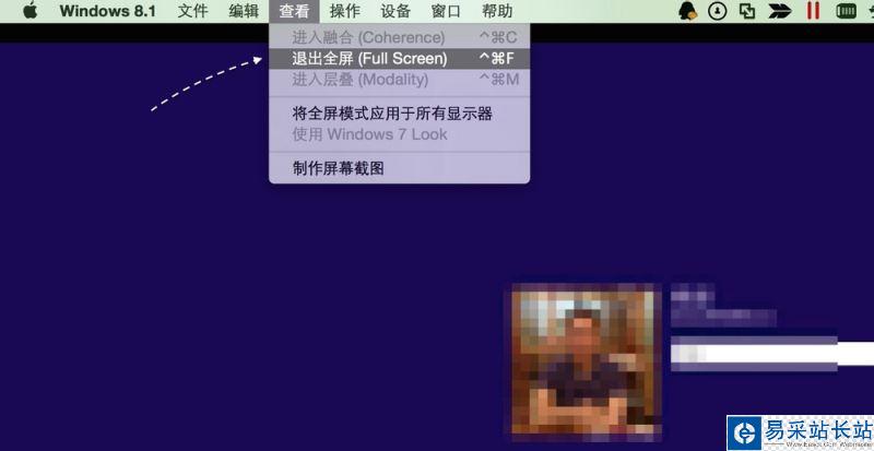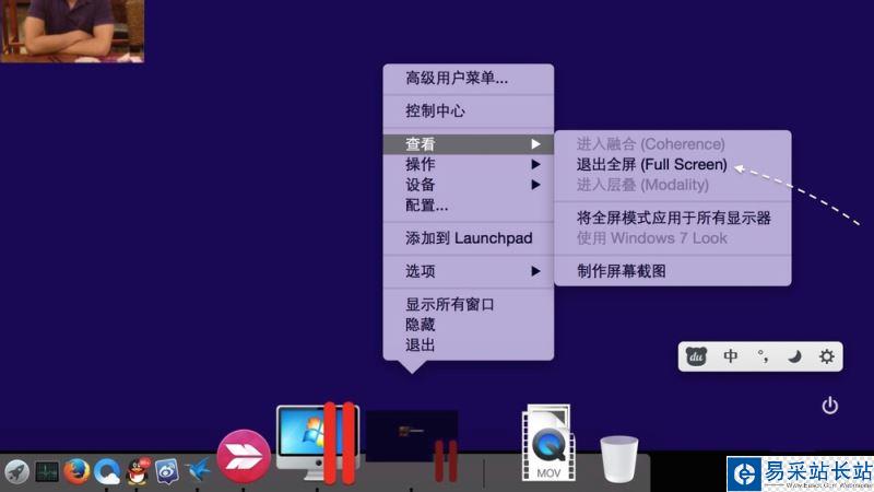 2、當我們按下 Ctrl+Alt 組合鍵以后,可以在 Dock 欄上右鍵點擊當前正在運行的虛擬機,在“查看”菜單中即可看到“退出全屏”選項,點擊即可退出。