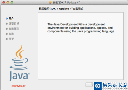 2、雙擊“JDK 7 Update 04.pkg”安裝圖標后就會彈出正式的安裝界面了,開始顯示的是軟件的簡介。點擊“繼續”按鈕: