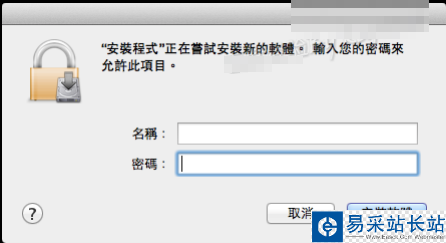 5、MAC系統由于隱藏性和安全性考慮,此時會彈出似win7一樣的UAC對話框,我們輸入本機的有安裝權限的帳號和密碼,再點擊“安裝軟件”按鈕繼續: