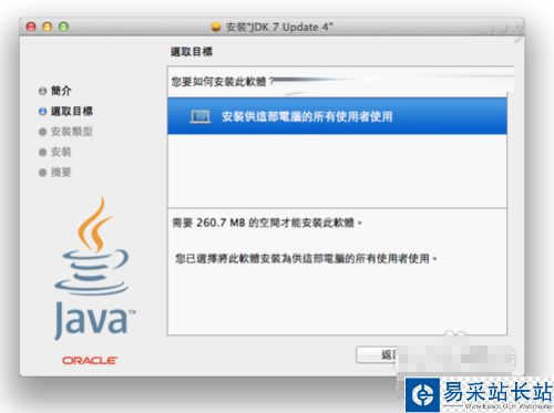 3、下面依然是.pkg文件安裝的一般步驟--“選取目標”,點擊里面的顯示的一項后,下面的“繼續”按鈕會變成可點擊狀態,再點擊之即可: