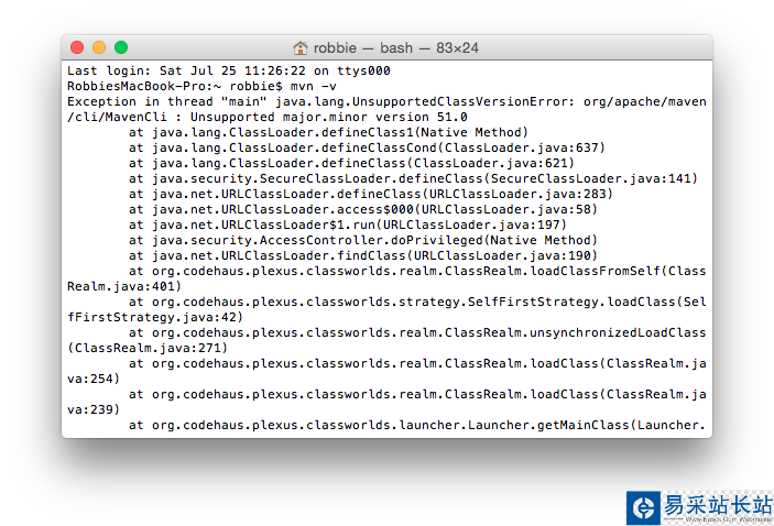 如果遇到以下異常,重新編輯bash_profile文件,增加export JAVA_HOME=/Library/Java/JavaVirtualMachines/jdk1.7.0_11.jdk/Contents/Home后,并重新運行$ source ~/.bash_profile即可。