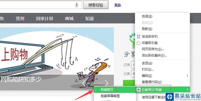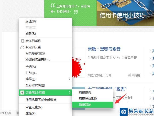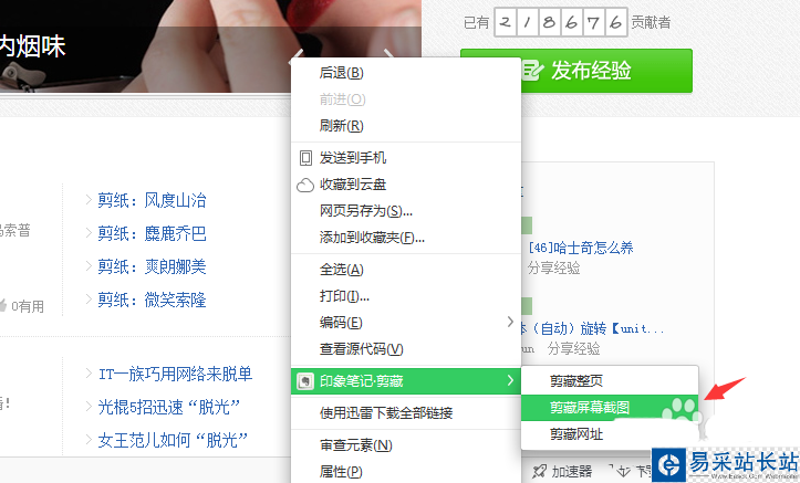 4、登錄賬號之后,在你需要剪藏的頁面,右擊會跳出一個菜單欄,看到印象筆記剪藏選項,第一個我們先介紹剪藏整頁,剪藏整頁會把一整個網(wǎng)頁包括下拉進行全剪藏,同步至你的印象筆記。