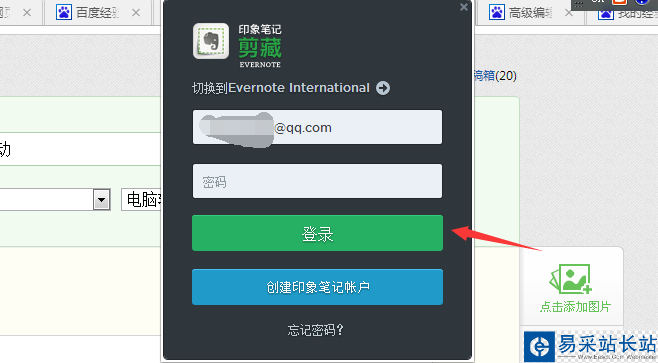 3、安裝好插件之后打開瀏覽器,點擊瀏覽器菜單欄里面的印象筆記按鈕圖標(biāo),先登錄你的賬號,沒有賬號的可以注冊一個。