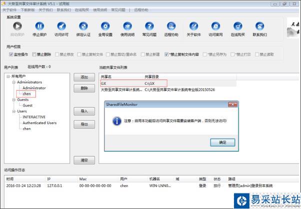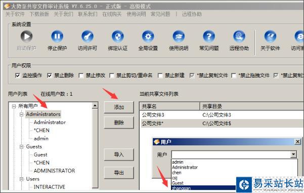 如果您已經設置了共享文件,則自動會在“當前共享文件列表”下面的框內出現,然后點擊共享文件夾,并點擊左側的用戶,即可激活上面的“用戶權限”各項功能,然后勾選相關控制功能,即可為此用戶設置了訪問此共享文件的相關權限。