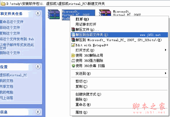 4.如果要從這兩個文件解壓出那個大的文件,就需要把這兩個小文件放在同一個目錄下,右鍵點擊Microsoft_ Virtual_PC_ 2007_ SP1_32bits.part1.rar,選擇“解壓到當前文件夾”,就會生成那個31.7MB的文件。