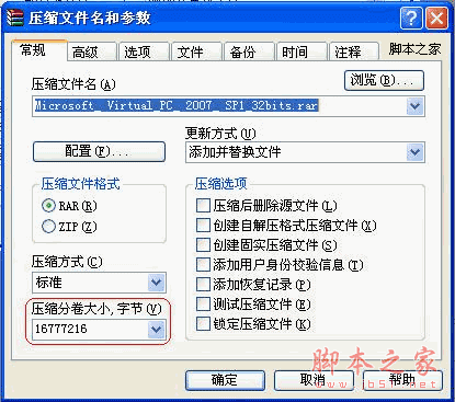 2.在出現的“壓縮文件名和參數”對話框中,在“壓縮分卷大小,字節(V)”下拉框中填寫一個數值,就填寫的是16777216,即16MB。