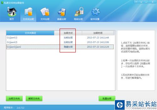 私房文件夾加密軟件提供了兩種可選的加密方式:加鎖加密和隱藏加密,很顯然加鎖加密方式是比較常用的,加密后的文件可以被其他人發現,但沒有你的密碼口令任何人也查看不了。而隱藏加密就更為安全了,加密后的文件直接隱藏起來,即使別人進入你的電腦也看不到該文件的存在,更談不上查看里面有什么內容了。具體使用哪一種加密方式,大家根據自己的需求選擇,加密后的文件夾可以從軟件窗口中查看到列表。如果你有多個文件夾都需要加密的話,可以點擊軟件窗口右下角的“批量加密”按鈕進行操作更方便,一次性完成對多個文件夾的加密,具體的方法與上面所說的單個文件夾加密相同,盡管放心嘗試。