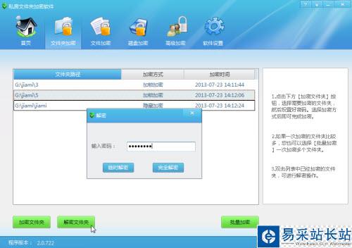 私房文件夾加密軟件使用簡單,學會了以上文件夾加密操作后,如果你想要對某些文件或整個磁盤進行加密,只需切換到對應的窗口中進行操作即可。加密后的文件夾、文件和磁盤等都需要通過私房文件夾加密軟件輸入你的密碼口令才能順利解密查看。如果是點擊“打開”按鈕的話,可以暫時查看加密文件內容,用完之后該文件繼續恢復加密狀態。而“解密”按鈕則徹底讓該文件夾解除加密狀態。