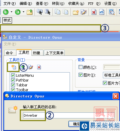 2. 如圖2,點擊“新建”按鈕(①),在輸入框中輸入驅(qū)動器欄的名字(②),比如“Driver”,確定。此時你會發(fā)現(xiàn)在列表窗上方出現(xiàn)了一個新的空白Toolbar(③)。