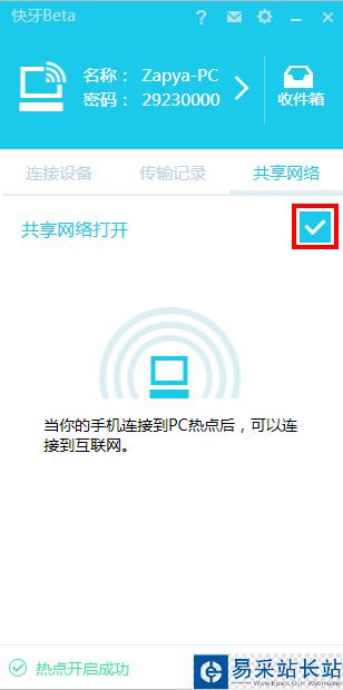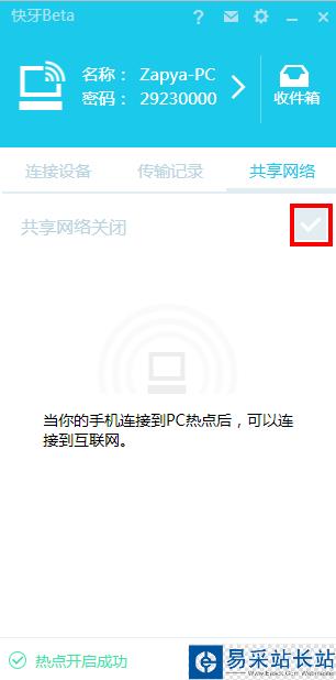啟動(dòng)“快牙電腦版”后,如果電腦已連接互聯(lián)網(wǎng),則“快牙電腦版”將自動(dòng)分享WiFi信號(hào),供其他設(shè)備連接上網(wǎng),此功能也可手動(dòng)關(guān)閉網(wǎng)絡(luò)共享。