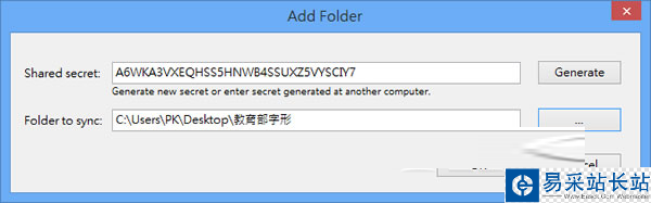 2.點(diǎn)擊[Generate],可產(chǎn)生新的 secret key,接下來(lái)在 Folder to sync 后選取要分享、共用的新文件夾,完成后點(diǎn)擊[OK]。