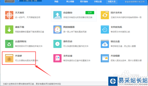 3、打開之后,我們可以在里面看到很多的功能,我們點擊【共享群】,如圖示。