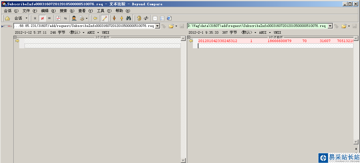 3. 在左右兩邊的下拉框中輸入我們需要對比的文件的目錄,并按回車,下方即可顯示文件的具體內容。我在下拉框中可以輸入本地文件路徑,網絡路徑,FTP路徑等多。下圖左側為FTP文件(訪問FTP時需要輸入用戶名和密碼),右側為本地文件。