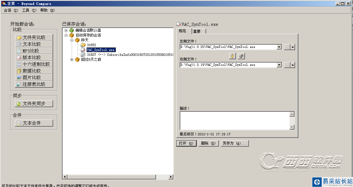 Beyond Compare是一個很不錯的文件/文件夾比較軟件,第三版的Beyond Compare是在第二版之上的完全重構。類似從第一版到第二版的過渡,第三版重新考慮了用戶界面,重新設計了內部基本結構并增加了顯著的新功能。Beyond Compare 可以對文本、mp3、圖片、數據、注冊表等進行比較分析。對于程序員,你可以用它來對比兩份代碼的變化,甚至可以用它來比較文件版本和文件夾。在進行文件比較的使用界面中,軟件提供了全部顯示、差異顯示、相同行顯示、逐段比較、交換兩側等極其方便的按鈕,使用文本差異一目了然,顯而易見。與其它同類軟件相比,Beyond Compare 3 除了具體以上全面的比較功能外,還附帶了文件合并和文件夾同步兩種實用工具。