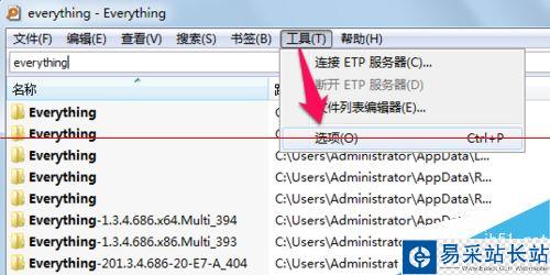 5、怎么能讓everything中文版使用起來更加方便呢,比如不想讓它的圖標出現在系統托盤中,又想快速的調出使用,我們點擊工具-選項。