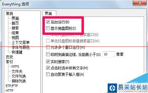 6、在Everything選項中我們勾選后臺運行,取消顯示托盤圖標。