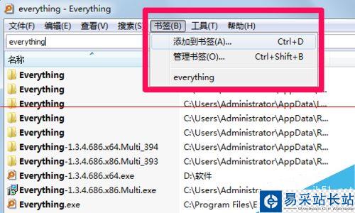 4、如果我們經常搜索同一個內容,那么我們還可以在everything中文版中點擊書簽,選擇添加到書簽,下次就可以直接點擊書簽搜索,從而提高工作效率了。